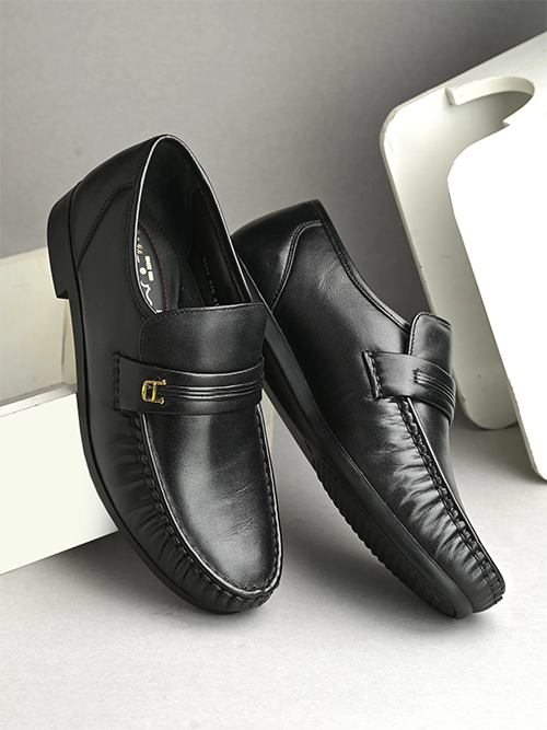 Elegant black loafers crafted from premium faux leather. Designed with a stylish metal accent and cushioned sole for comfort. Perfect for office wear, formal events, or daily sophistication.